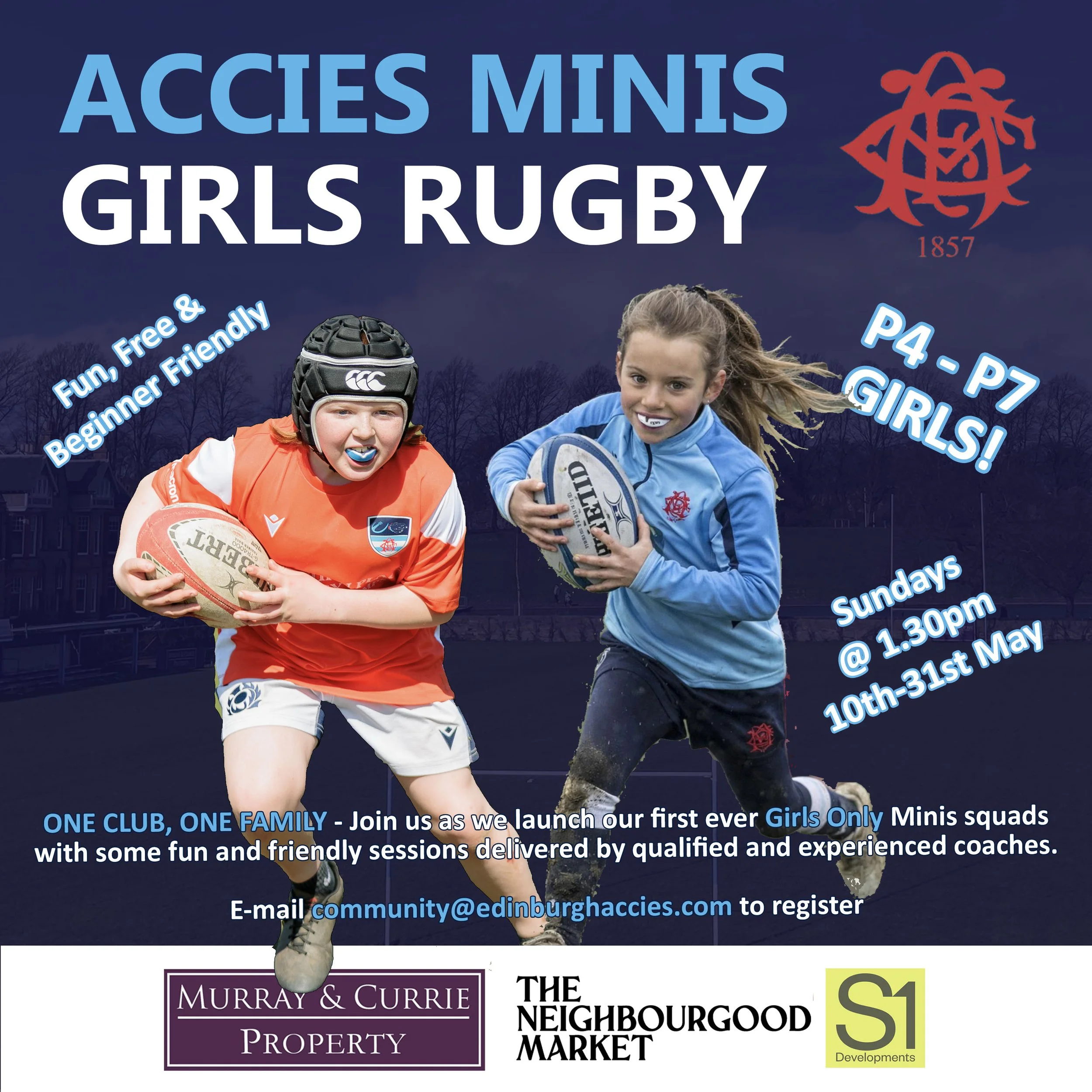 Edinburgh Accies Minis are delighted to launch our first ever girls only rugby sessions which will be open to P4-P7* girls from any school. Rugby is renowned for developing teamwork, confidence and resilience and we take great pride in offering a fun and welcoming club environment – please check out this link for reasons to give rugby a try: Why Girls Should Play Rugby